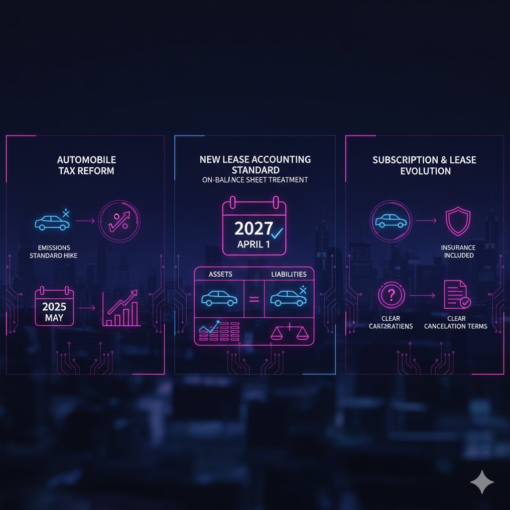 - 新リース会計基準が2027年から完全施行(早期なら2025年から)。これにより、法人は車のリースを「借り物」とは呼べなくなる。