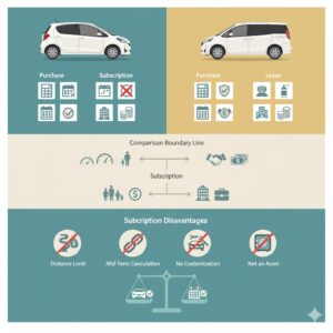 購入 | 資産になる/距離制限なし/カスタム自由 | 税金・車検・保険の支払いは自己管理 | 長期利用派・走行距離が多い人 |