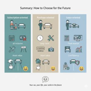 ここまで、サブスク・リース・購入の違いを見てきました。
