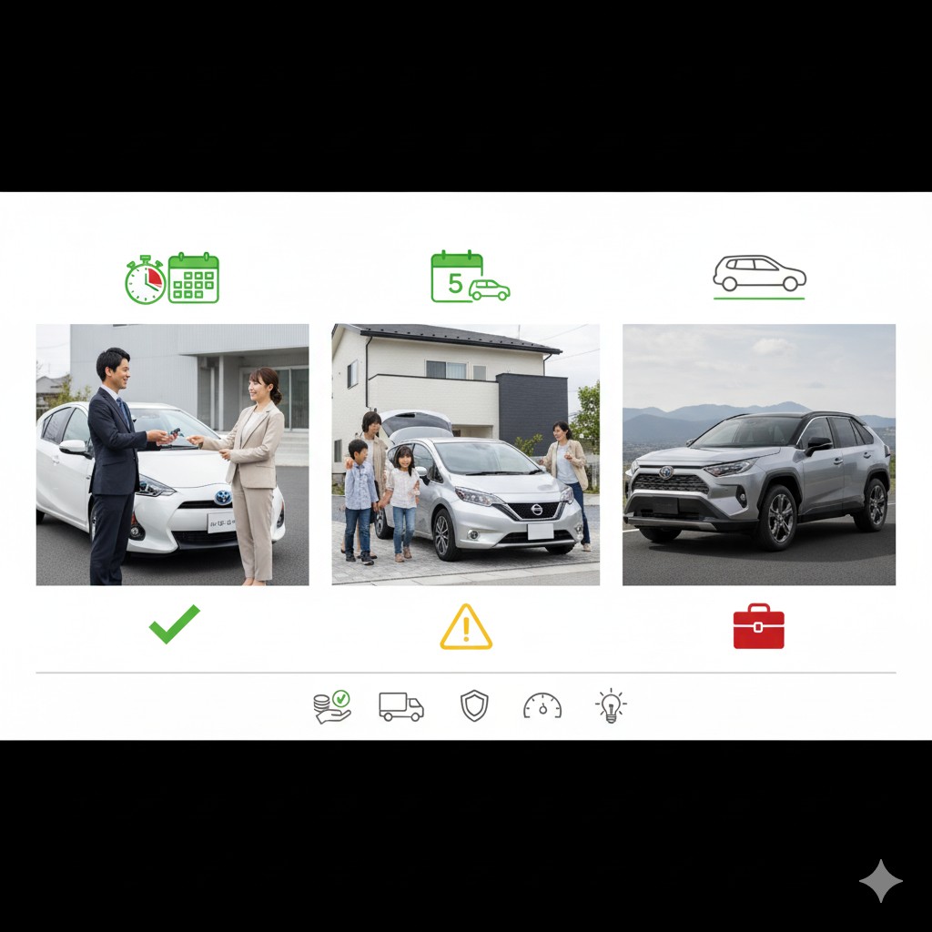• 短期リース業者(例:ニコリース):在庫次第でトヨタ中古車を短期利用可能(最短5日)